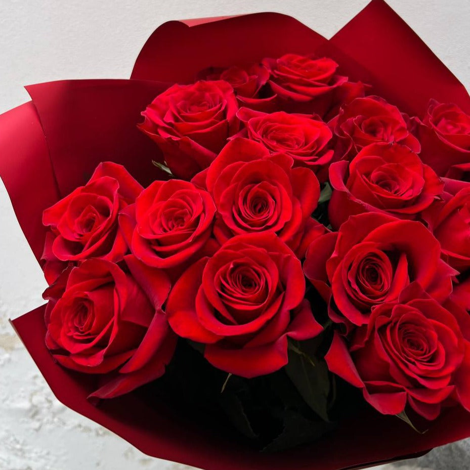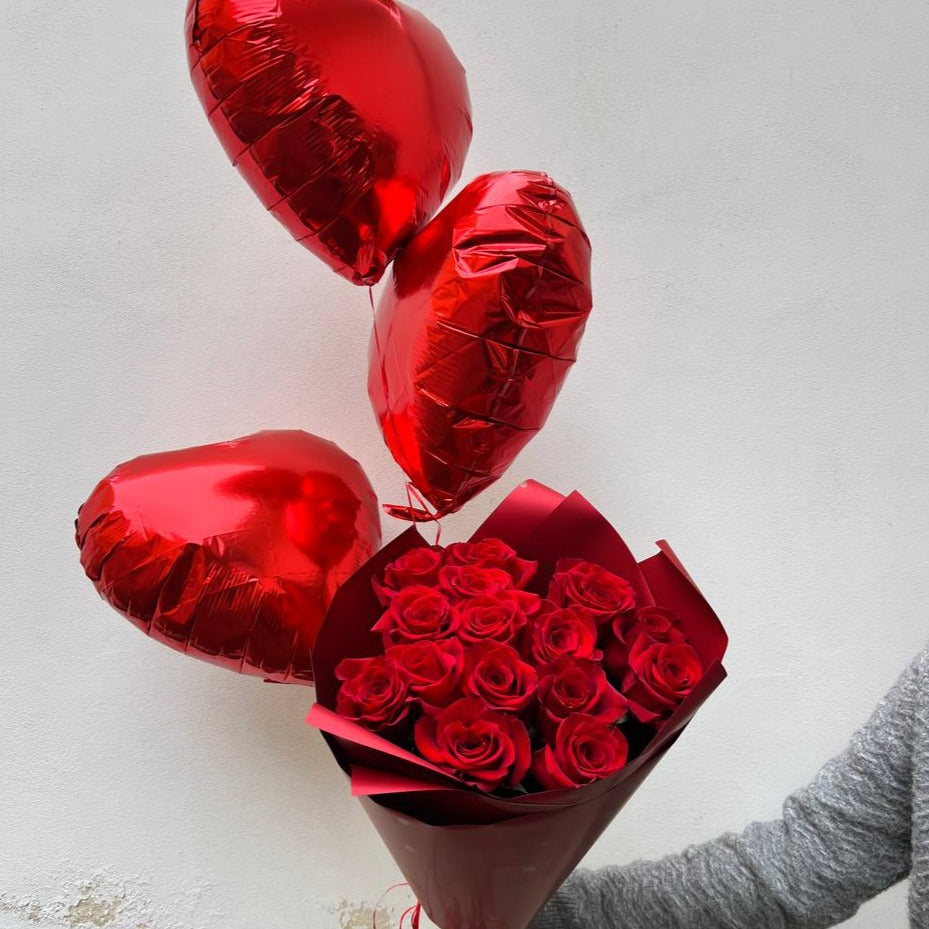 Na foto jsou červené růže o délce 70 cm a balonky.