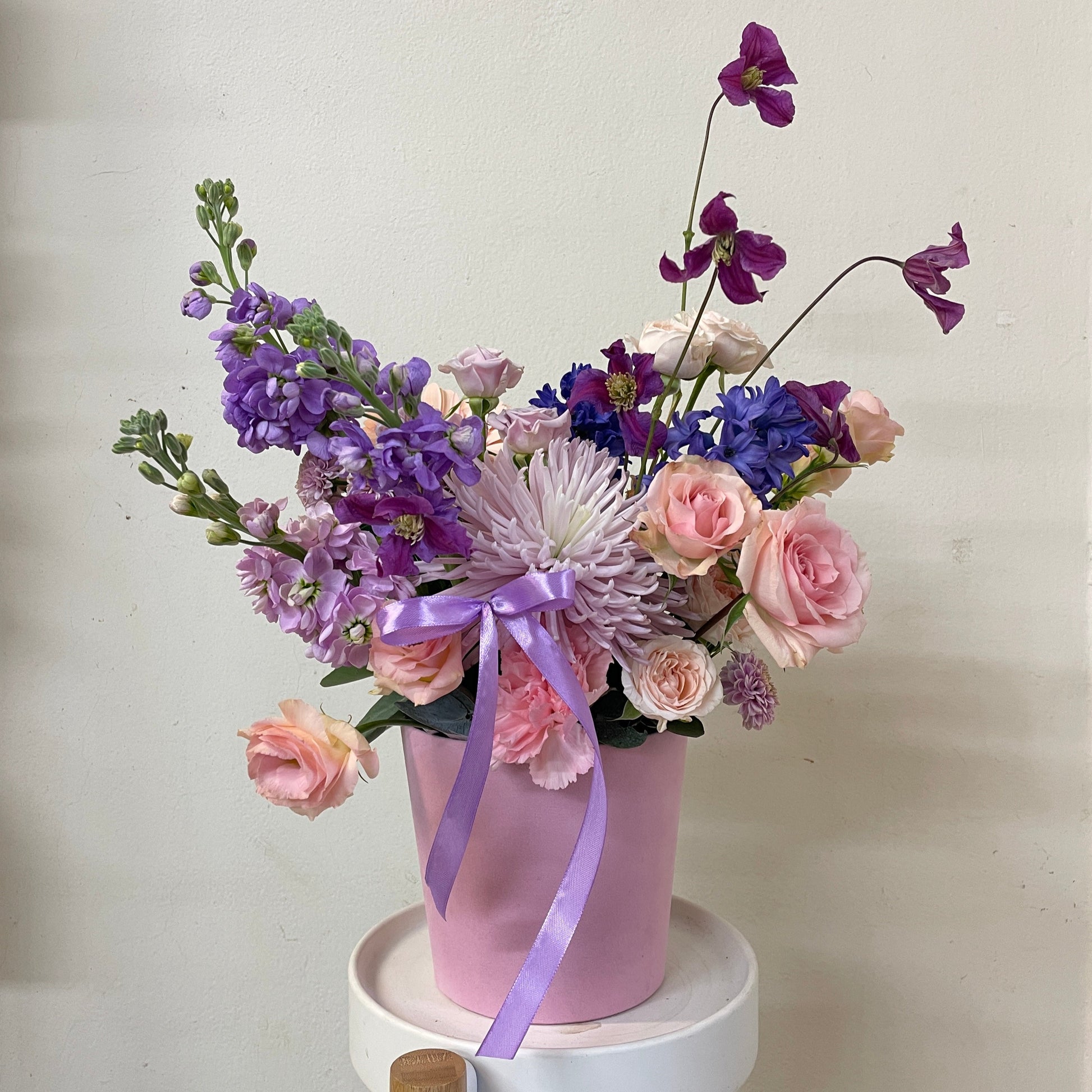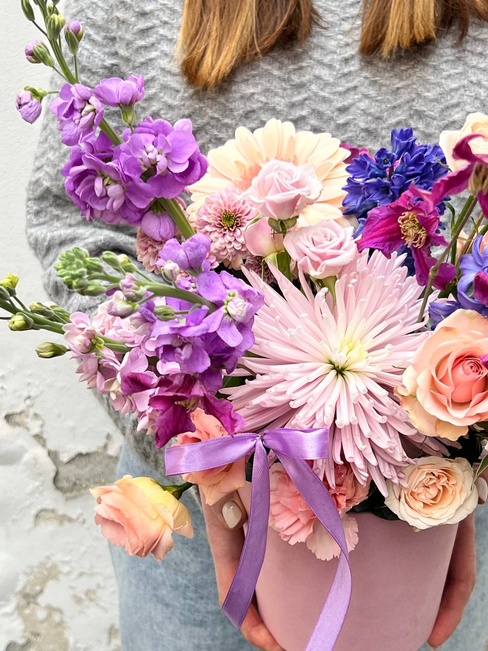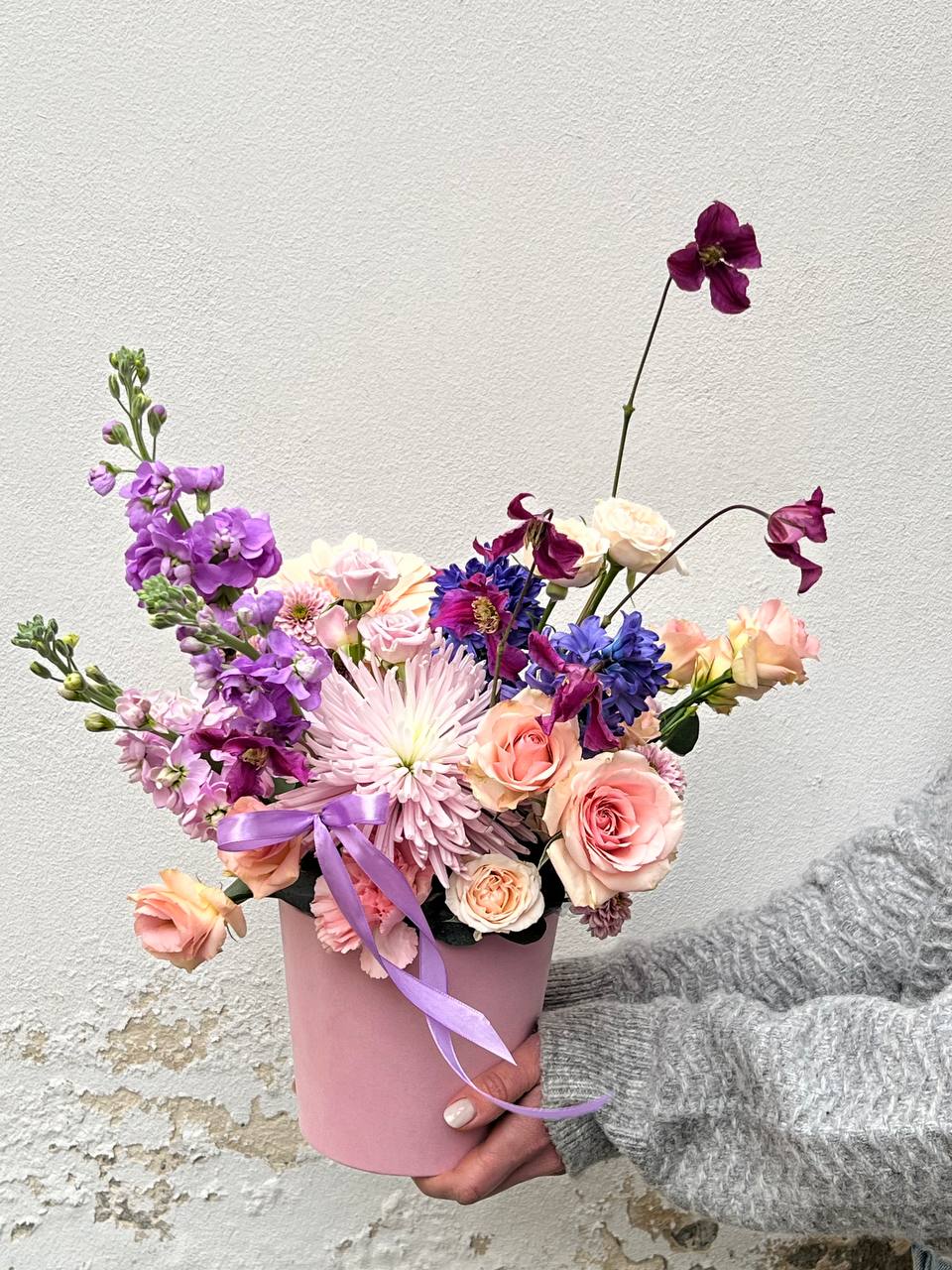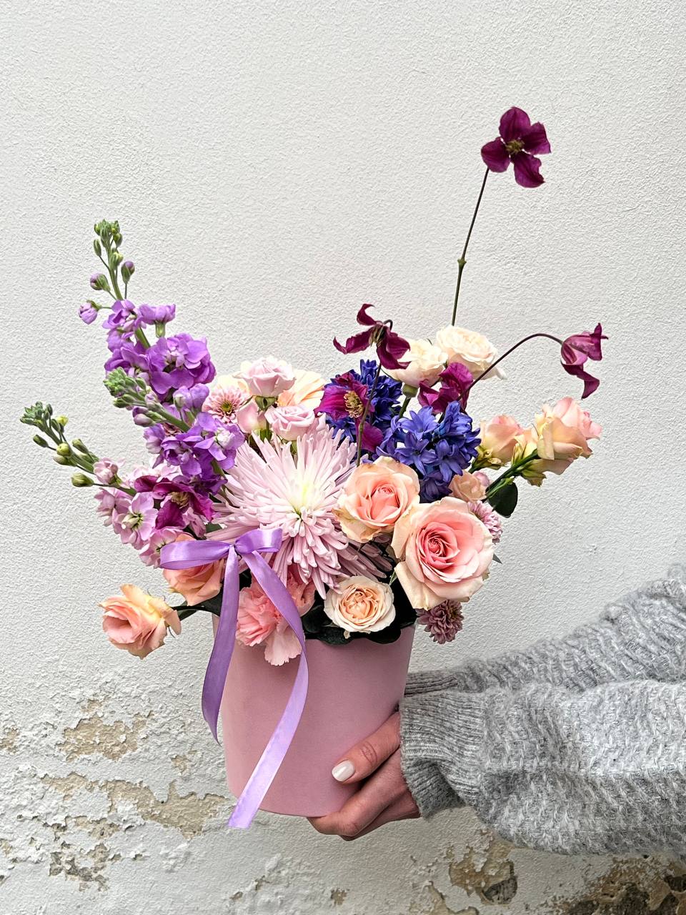 V květinové krabičce jsou naaranžované trsové růžičky, chrysanthema, matthiola.