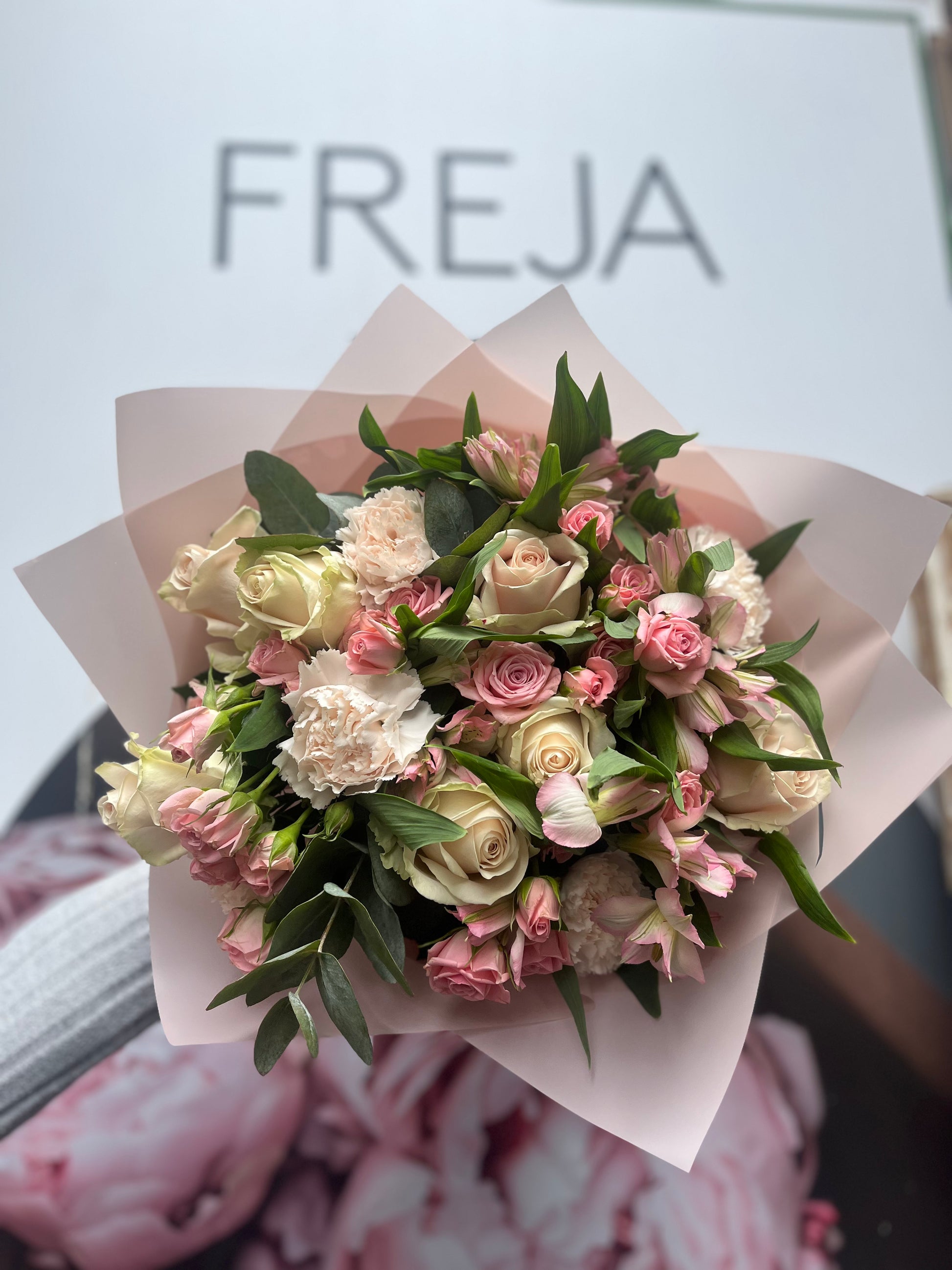 Na foto jsou bílé nebo růžové růže, alstromérie, karafiát a trsová růže.