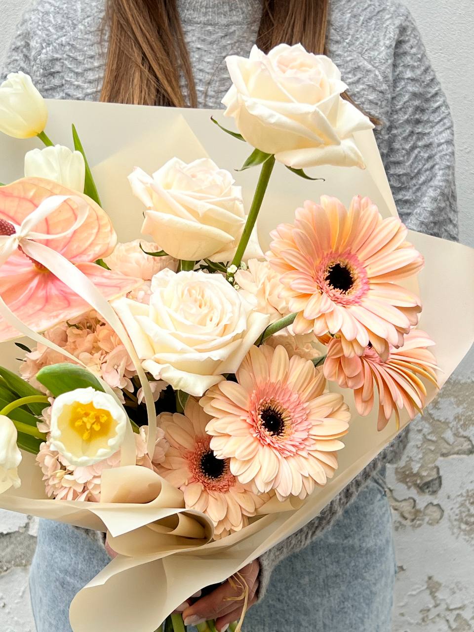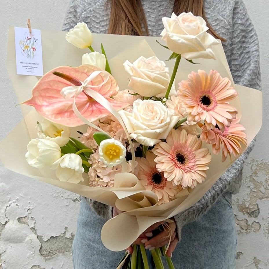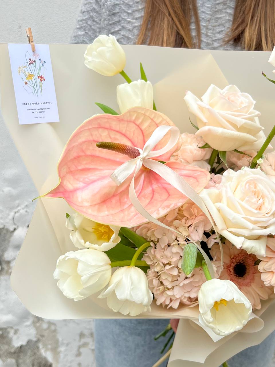 Krásná kytice v něžných odstínech, která je uvázaná z anthurie, růžíček, tulipánů.