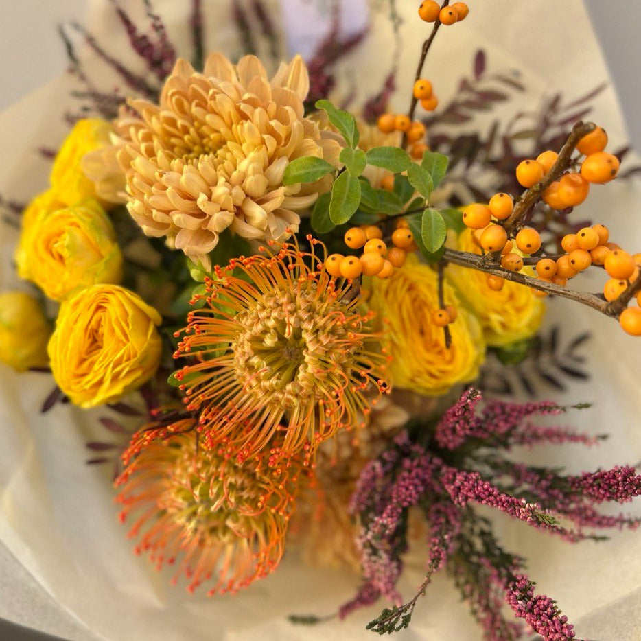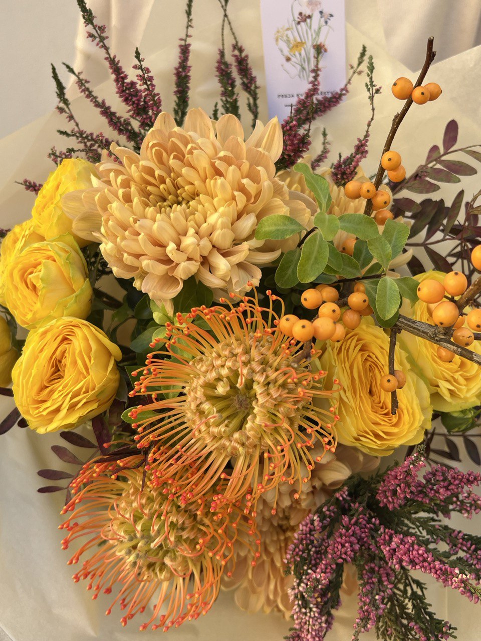 V kytičce na foto jsou růžičky, ilex, chrysanthema, vřes.