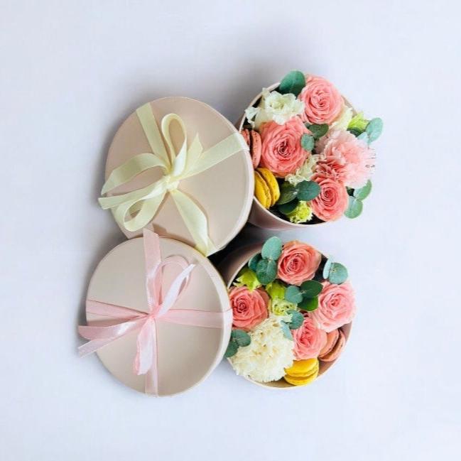 V krabičce jsou naaranžované květiny v růžové / meruňkové nebo bílé barvě dle sezonní nabídky květu. Aranžmá je doplněno sladkým překvapením, 2 kusy lahodných makronek!
